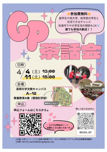 長崎発グローカル人材育成プログラム学生企画運営協議会(GP)より、4月イベントのお知らせです。