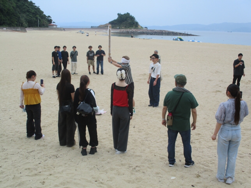 海岸沿いに散策して砂浜へ移り、時折の小雨を気にかけながらも気楽に身体を動かすゲームをいくつか行い、 編成に配慮したチーム対抗で異なる出身背景や異なる「得意」を理解できたり違いを感じながらもつながる仲間意識が生まれた様子でした。